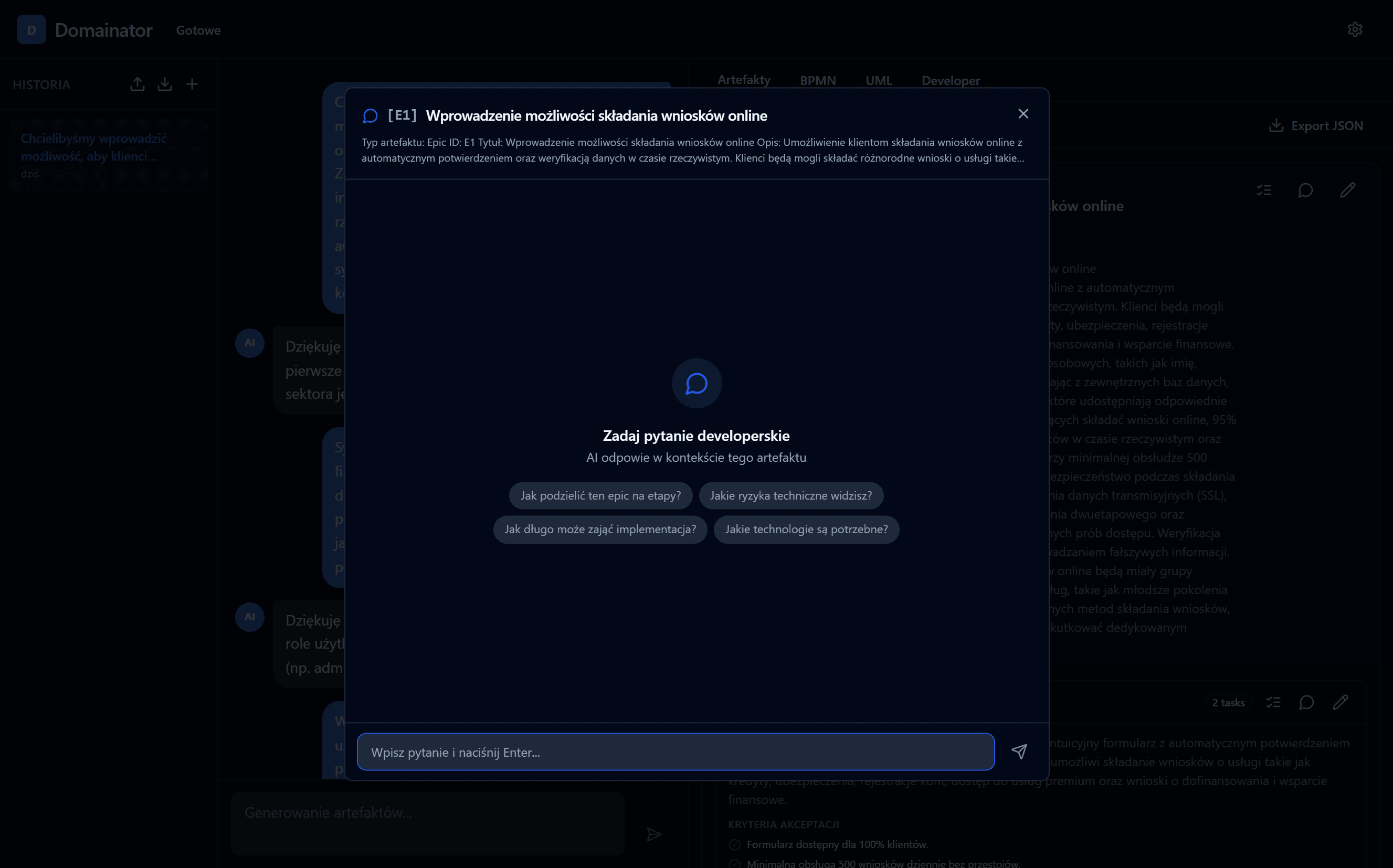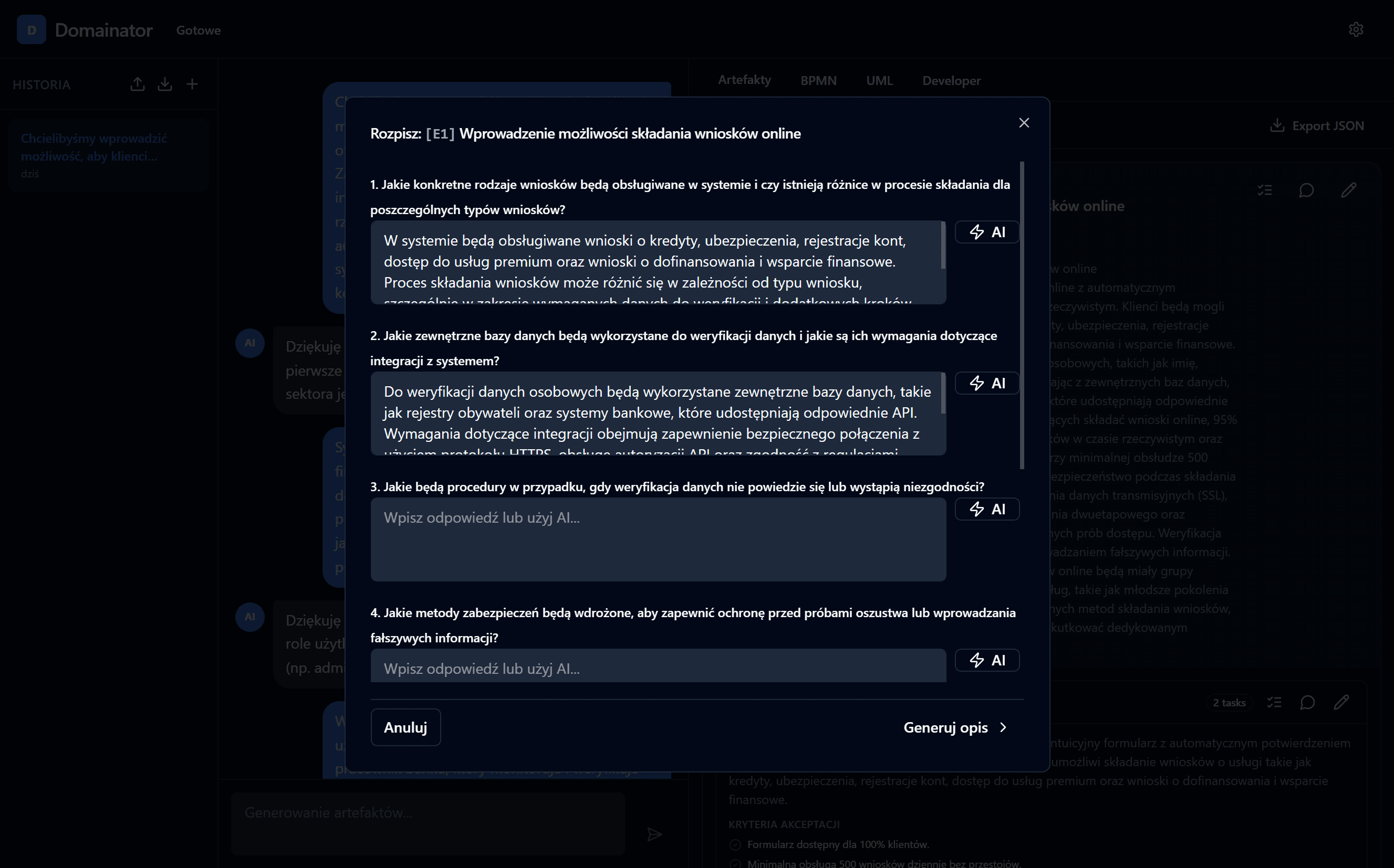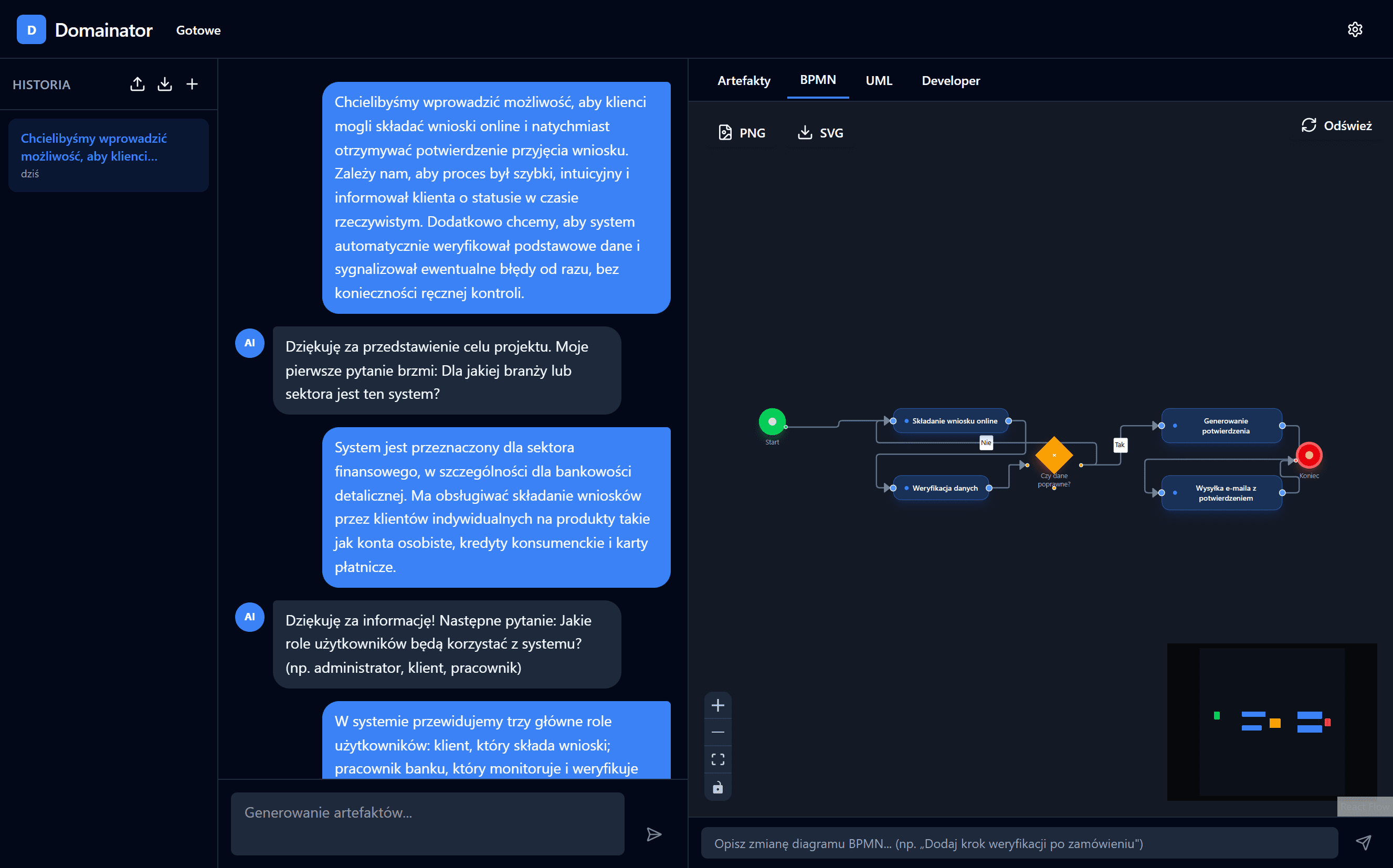 Narzędzie do konwersji opisów biznesowych na diagramy / procesy architektury systemów. Umożliwia wizualizację i planowanie architektury IT na podstawie naturalnego języka, co ułatwia komunikację między zespołami technicznymi a biznesowymi.