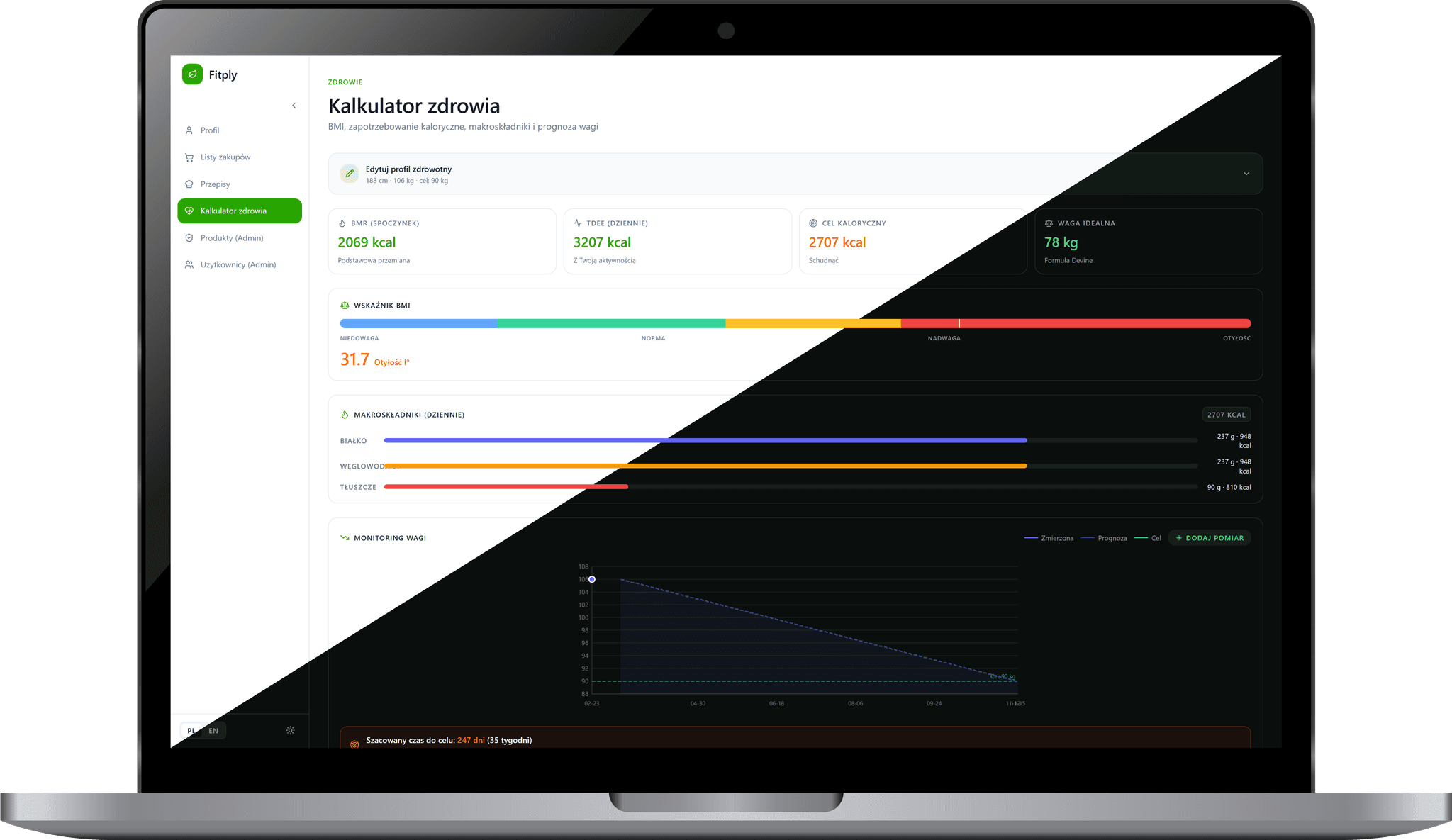 Kompleksowy panel do planowania diet i zakupów z wbudowaną analityką pozwalającą kontrolować stopień zbilansowania codziennego jadłospisu. Aplikacja została stworzona z myślą o wygodnym planowaniu posiłków oraz automatycznym generowaniu list zakupowych. Pomysł powstał na bazie codziennej rutyny związanej z układaniem diety i przygotowywaniem list produktów — dlatego celem projektu było stworzenie narzędzia, które znacząco usprawni i przyspieszy cały ten proces.